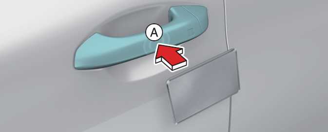등록된 디지털 키 2(카드 키)의 NFC 안테나를 운전석 또는 동승석 도어 손잡이 인증 패드(A)에 약 2초 이상 접촉하면 도어가 잠금 또는 잠금 해제됩니다.