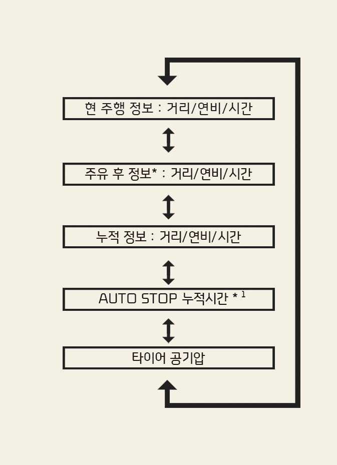 LCD 표시창에서 트립 컴퓨터 모드 진입 후, 조작 버튼으로 트립 모드를 변경할 수 있습니다.