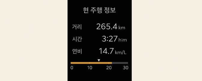 주행 거리/연비/시간 초기화 시점부터 현재까지의 누적 정보를 표시합니다.
