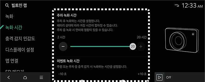 12 V 리튬 보조 배터리 충전량에 따른 녹화 가능한 예상 시간을 빌트인 캠 메뉴의 주차 녹화 가능 시간 또는 Kia Connect 앱을 통해서 확인할 수 있습니다. 휴대폰에서는 주차 녹화 가능 시간은 Kia Connect 서비스에 가입한 경우에만 확인할 수 있습니다.