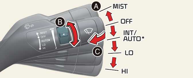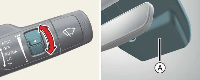 ODL3033073_20차 안 중앙 앞유리 상단에 설치된 센서(A)에서 비의 양을 감지하여 양이 많아지면 와이퍼 작동 속도가 빨라지고, 양이 적어지면 느려지다가 비가 멈추면 작동도 멈춥니다. 와이퍼 속도를 변경하려면 속도 조절 노브(B)를 돌려 조절하십시오. 위쪽으로 돌리면 속도가 빨라지고 아래쪽으로 돌리면 속도가 느려집니다.