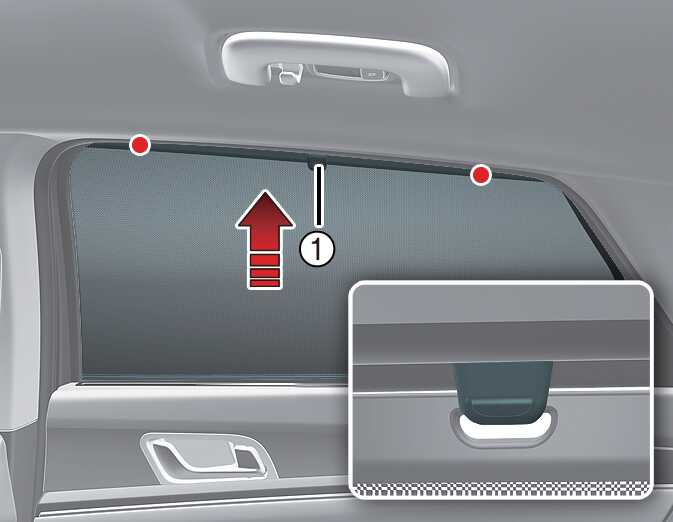 뒷좌석 측면 수동 선커튼 (사양 적용시) ODL3033062 뒷좌석 유리를 통해 들어오는 외부 광선을 차단하려면 다음과 같이 사용하십시오. 커튼 고리(1)를 잡고 올리십시오. 장착된 양쪽 후크에 커튼을 거십시오.