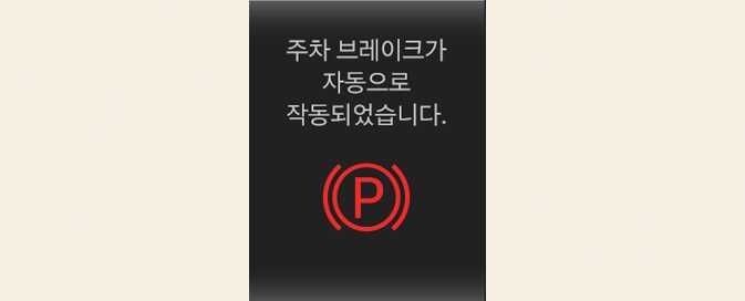 자동 정차 상태(AUTO HOLD)에서 전자식 파킹 브레이크 전환이 불가할 때 LCD 표시창에 경고 문구가 표시되고 경고음이 울립니다. 이때는, 브레이크 페달을 밟으십시오.