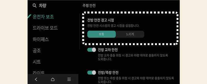 경고 시점을 보통으로 설정해도 전방 차량이 급제동하는 경우에는 경고가 느리게 느껴질 수 있습니다.