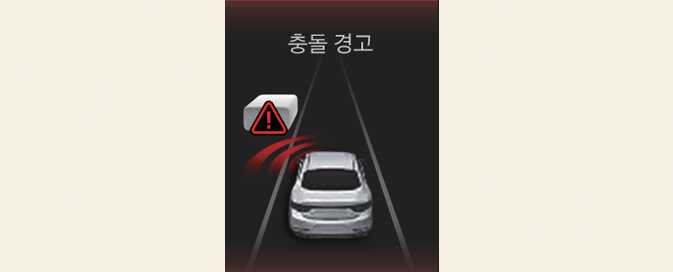 」 깜빡임, 경고문, 경고음, 스티어링 휠 진동(사양 적용 시)을 통해 충돌 경고를 알립니다.