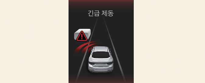 긴급 제동에 의한 정차 시 클러스터 등에 경고문이 표시됩니다. 안전을 위해 즉시 브레이크 페달을 밟고, 주변 상황을 확인하십시오.