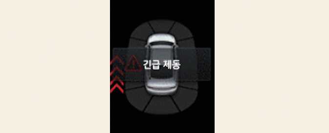충돌방지 보조에 의한 정차 시 클러스터 등에 경고문이 표시됩니다. 안전을 위해 즉시 브레이크 페달을 밟고 주변 상황을 확인하십시오.