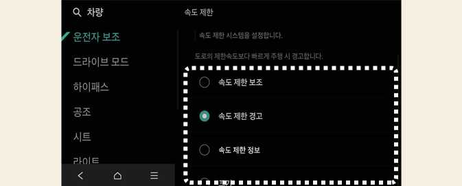 시동 「ON」 상태에서 인포테인먼트 시스템의 설정 → 차량 → 운전자 보조 → 속도 제한을 차례로 선택하십시오. 각 기능의 사용 여부를 설정할 수 있습니다.