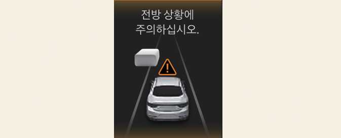 전방 상황 주의 알림이 발생하면 새롭게 나타난 전방의 차량이나 물체와 충돌할 수 있습니다. 전방 도로 상황 및 주행 상태를 확인하고 필요하면 브레이크 페달을 밟아 직접 속도를 조절하십시오.