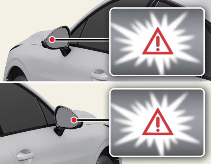실외 미러(사이드 미러) 경고등, 경고문, 경고음, 스티어링 휠 진동(사양 적용 시)을 통해 충돌 경고를 알립니다.