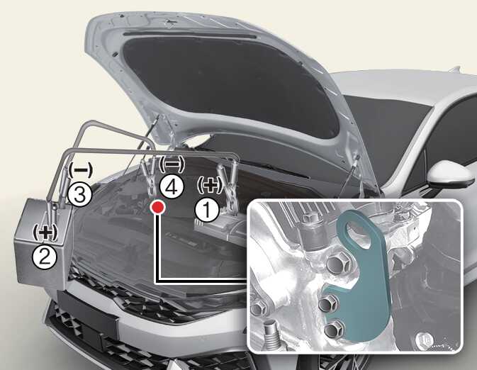 적절한 위치의 엔진 리프트 브래킷을 찾을 수 없을 때는 도장이나 코팅이 되지 않은 차체(금속 부분)에 연결하셔도 됩니다. 엔진이 시동될 때 움직이는 부품의 근처나 배터리의 단자에 절대 연결하지 마십시오. 또한, 정확한 배터리 극이나 정확한 접지를 제외하고는 점프 케이블을 어떠한 곳에도 닿지 않도록 하고, 연결할 때 배터리에 무리하게 힘을 가하지 마십시오.