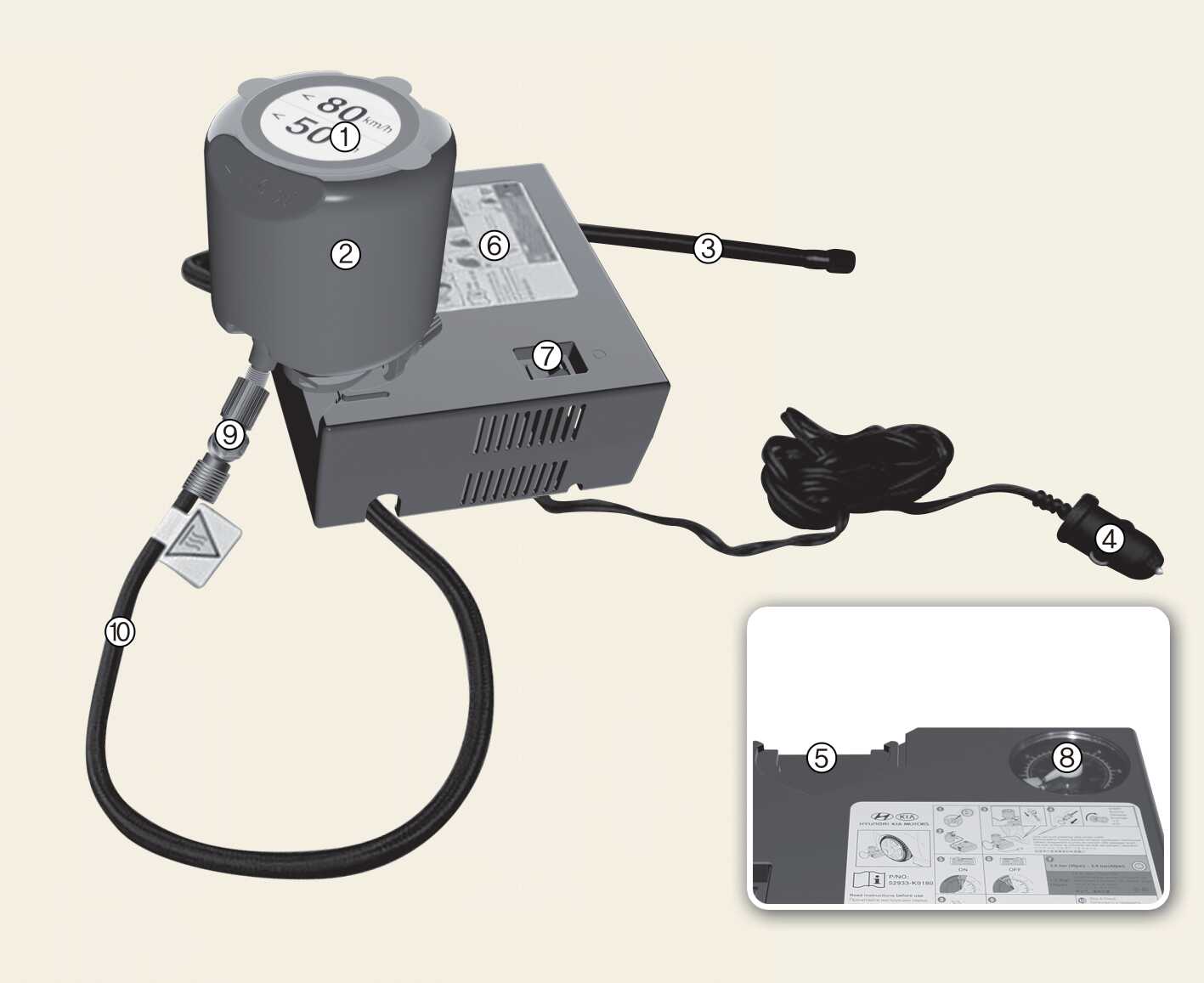 타이어 임시 수리 장치를 사용하기 전 컴프레서 위의 설명서를 반드시 숙지 하십시오.