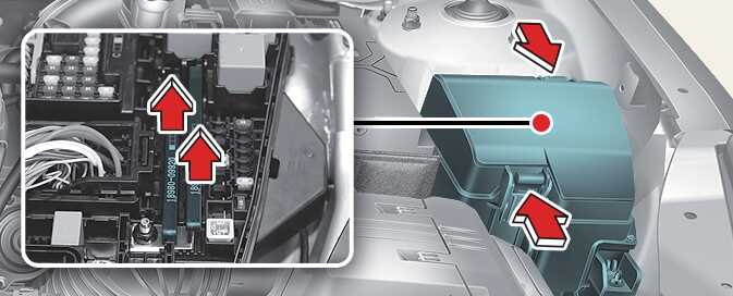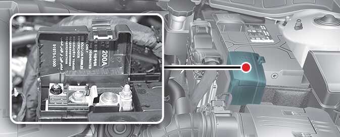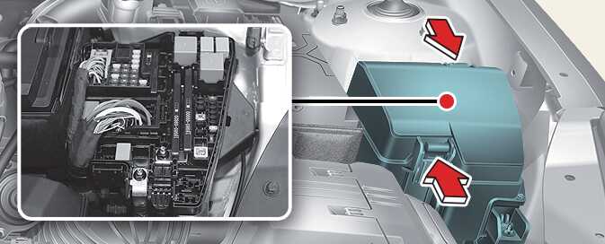 엔진룸 퓨즈 박스 커버를 닫을 시 락킹음을 확인해 커버 닫힘을 확인하십시오. 엔진룸 퓨즈 박스 커버가 정상 체결되지 않으면 수분 유입으로 인해 전자 장치가 비정상적으로 작동할 수 있습니다.