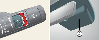 차 안 중앙 앞유리 상단에 설치된 센서(A)에서 비의 양을 감지하여 양이 많아지면 와이퍼 작동 속도가 빨라지고, 양이 적어지면 느려지다가 비가 멈추면 작동도 멈춥니다. 와이퍼 속도를 변경하려면 속도 조절 노브를 돌려 조절하십시오. 위쪽으로 돌리면 속도가 빨라지고 아래쪽으로 돌리면 속도가 느려집니다.