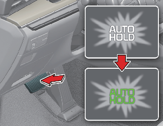 「D」(주행), 「R」(후진), 스포츠 모드에서 가속 페달을 천천히 밟고 출발하면 브레이크 상태가 해제되면서 차량은 출발합니다. 「AUTO HOLD」 표시등은 초록색에서 흰색으로 바뀌고, 자동 정차 기능(AUTO HOLD)은 작동 대기 상태가 됩니다.