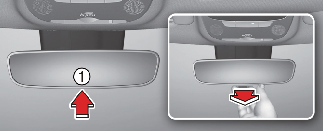 야간 주행 시 주·야 변환 레버(1)를 운전자 방향으로 당기면 뒷차량의 전조등 불빛으로 인한 눈부심을 줄일 수 있습니다.
