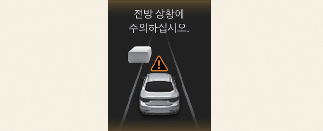 전방 상황 주의 알림이 발생하면 새롭게 나타난 전방의 차량이나 물체와 충돌할 수 있습니다. 전방 도로 상황 및 주행 상태를 확인하고 필요하면 브레이크 페달을 밟아 직접 속도를 조절하십시오.
