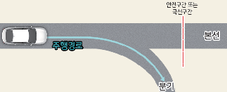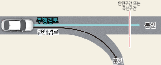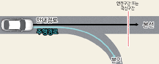 안내 경로(본선)와 주행 경로(분기)에 차이가 발생하면 전용도로 본선의 안전구간 또는 곡선구간 정보에 의해 고속도로 안전구간 자동감속 또는 고속도로 곡선구간 자동감속 기능이 일시적으로 작동할 수 있습니다.