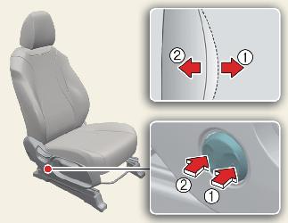 The front seat can be adjusted by using the control switches located on the outside of the seat cushion. Before driving, adjust the seat to the proper position to easily control the steering wheel, pedals and switches on the instrument panel.