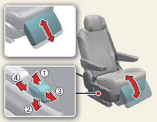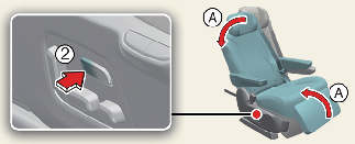 Adjust the angle (1, 2) and length (3, 4) of the leg support whilst holding the leg support. When using the leg rest, move the seat to the inner position, and then toward the back. If the seat is not moved far back, it may come in contact with the first row seat.