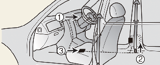 The seat belt pre-tensioner system consists mainly of the following components. Their locations are shown in the illustration:
