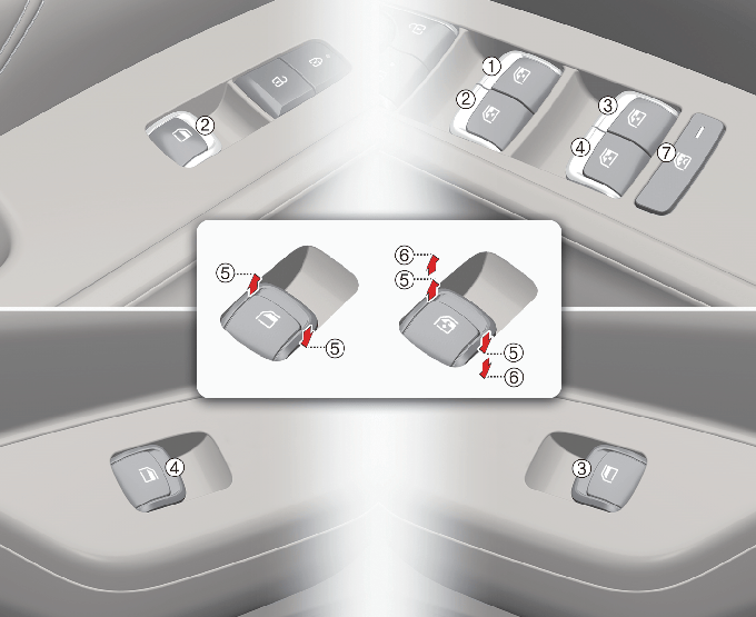 Each door has a power window switch that controls the door's window. The driver has a power window lock button which can block the operation of rear passenger windows. The power windows can be operated for approximately 3 minutes after ignition switch or ENGINE START/STOP button turned to the ACC or LOCK position. However, if the front doors are opened, the power windows cannot be operated even within the 3 minutes period.