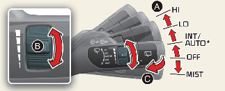 INT/---: Wiper operates intermittently at the same wiping intervals. Use this mode in light rain or mist. To vary the speed setting, turn the speed control knob.