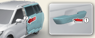 When the door is fully open, the door will lock into an open position. To close the door, pull out the door handle (1) and slide the door (2) towards the front of vehicle.