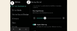 The Warning Methods can be set with the vehicle on. Select Setup → Vehicle → Driver Assistance → Warning Methods from the settings menu in the infotainment system to change the following settings: