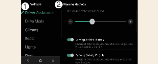 Warning Methods can be scanned be set with the vehicle on. Select Setup → Vehicle → Driver Assistance → Warning Methods from the settings menu in the infotainment system to change the following settings:
