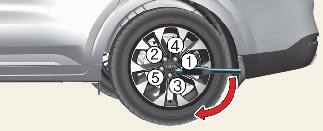 Loosen the wheel lug nuts counterclockwise one turn each, but do not remove any nut until the tyre has been raised off the ground.
