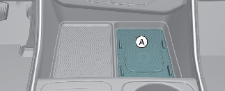중앙 콘솔 앞쪽에 스마트폰 무선 충전을 위한 시스템이 적용되어 있습니다. 스마트폰을 충전하기 위해서는 차량의 도어를 모두 닫고 시동 버튼 「ON」 상태에서 무선 충전이 지원되는 스마트폰을 충전 패드(A) 위에 올려놓으십시오.