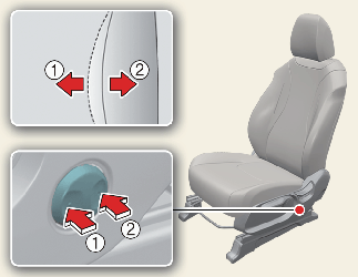 조절 스위치의 앞쪽(1)을 올리거나 내리면 시트의 앞부분이 올라가거나 내려오고, 조절 스위치의 뒤쪽(2)을 올리거나 내리면 시트 전체가 올라가거나 내려옵니다.