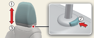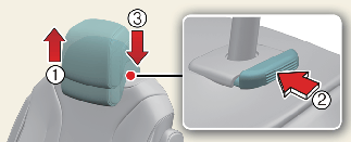 헤드레스트를 높이려면 헤드레스트를 잡고 잠기는 위치까지 위로 당겨 올리십시오 (1). 헤드레스트를 낮추려면, 잠금 해제 버튼을 누른 상태에서(2) 헤드레스트를 위에서 누르십시오(3).