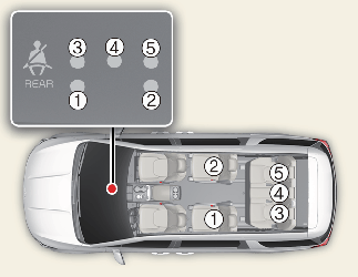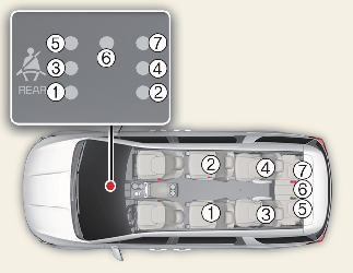 뒷좌석 안전벨트 경고등 및 경고음은 다음과 같은 조건에서 작동합니다. 경고등은 맵램프에 표시됩니다.