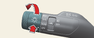 조명 스위치를 AUTO(자동 켜짐) 위치로 돌리고 클러스터 방향으로 밀 경우 클러스터에 「