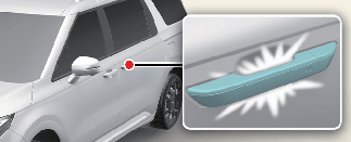 인포테인먼트 시스템의 설정 메뉴에서 웰컴 미러/라이트의 운전자 접근 시가 설정되어 있을 경우 스마트키를 휴대하고 실외 도어 손잡이에 1 m 이내 접근하면 켜집니다.