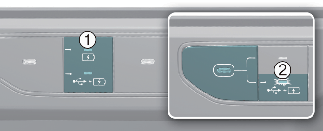 시동이 걸린 상태에서 버튼(1)을 누른 후 USB 데이터/충전 단자 표시등(2)이 켜지면 USB 데이터/충전 단자를 이용할 수 있습니다.