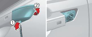 비상시 커버(2) 탈거 후 비상 키를 이용하여 운전석 도어만 잠그거나 열 수 있습니다.