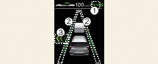 주행속도가 약 60 km/h 이상인 경우, 옆 차로에 근접 차량이 있으면 차로 내에서 반대 방향으로 편향하여 주행하도록 도와줍니다. 옆 차로 모두에 근접 차량이 있으면 편향하여 주행하지 않습니다.