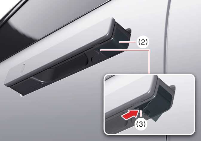 - Pull the door handle while pressing the front part of the outside door handle (1) (front side of the vehicle). Then remove the cover (3) under the rear part of the door handle (2).