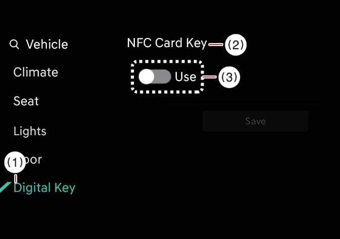 When there is a digital key (card key) already saved in the vehicle, the Save menu is disabled. If you want to save a digital key again, refer to How to delete digital key (smartphone) and follow the procedure for deleting an existing digital key first before saving a new digital key.