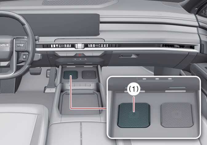 - With the vehicle on, place the card key on the wireless charging pad (1), and tap Save on the infotainment system screen. The saving process will begin automatically.