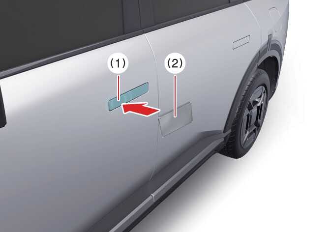 If the driver touches the NFC antenna of the registered card key 2 to the driver’s or passenger’s door handle authentication pad (1) for more than 2 seconds, the door will lock or unlock.