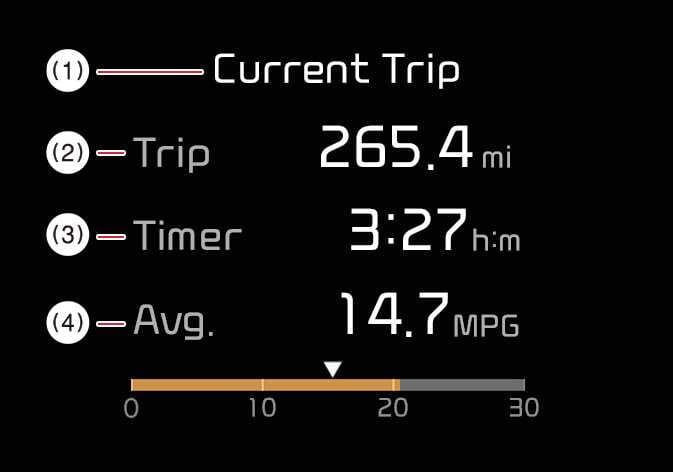 This display shows the accumulated trip distance, the average fuel efficiency, and the total driving time.