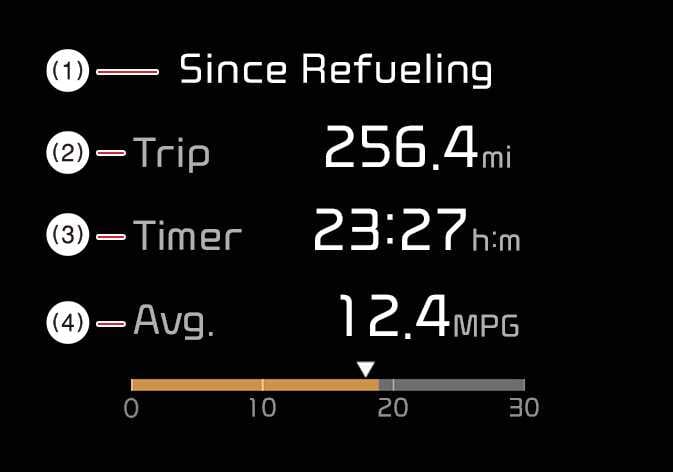 This display shows the trip distance, the average fuel efficiency, and the instant fuel efficiency (or the total driving time) since refueling.