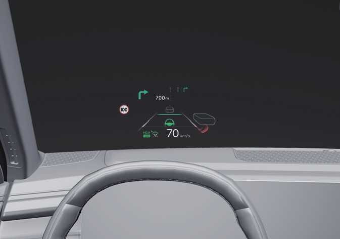 The Head-Up Display is a transparent display that projects an image of certain information from the instrument cluster and navigation system onto the windshield glass.