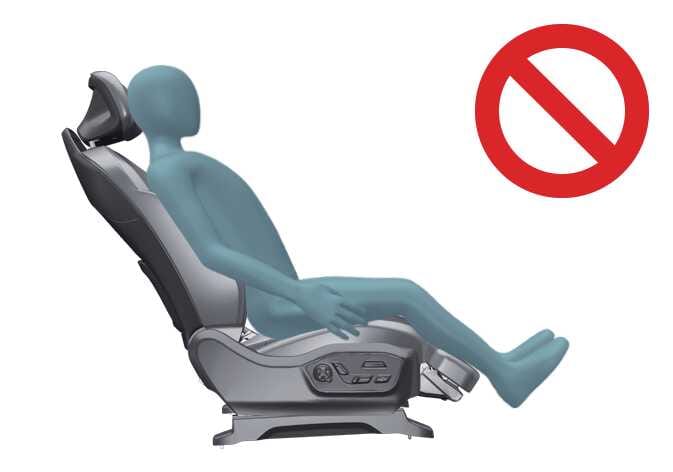 The driver must advise the passengers to keep seatbacks in upright positions whenever the vehicle is in motion. If a seat is reclined during an accident, the restraint system’s ability to restrain the passenger is greatly reduced.