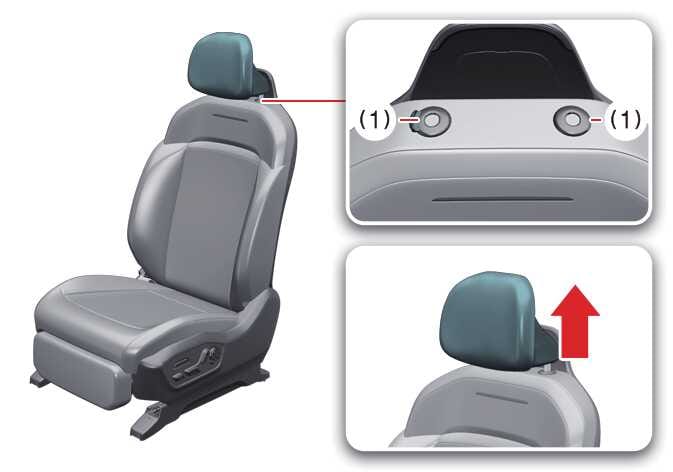 - Press the headrest release buttons (1) simultaneously while pulling the headrest up.