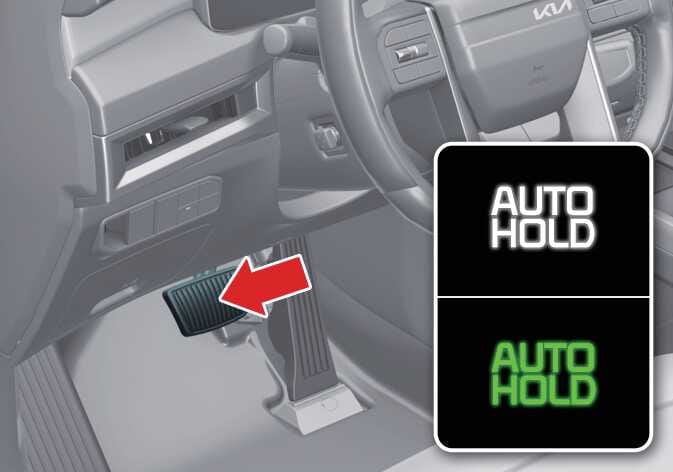 If you engage the accelerator pedal with the vehicle in D (Drive), the AUTO HOLD function is released automatically, and your vehicle starts to move. The AUTO HOLD indicator light changes from green to white, indicating that the AUTO HOLD function is in standby and the EPB is released.